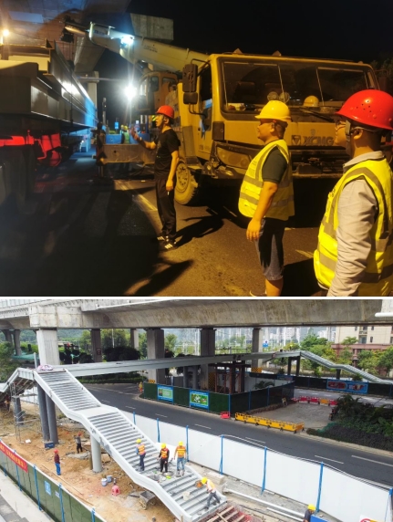 由于人行天橋項目建設(shè)所處的位置地下含高壓線等管線,施工環(huán)境較為復(fù)雜,且又處在交通通行量大的東環(huán)高速高架橋下,由于空間受限,鋼箱梁吊裝與高架橋最近的距離僅有5公分,吊裝難度極大。為此,我們采取雙吊車協(xié)同施工、錯峰施工和夜間施工的辦法。為確保施工安全,市政集團從上至下高度重視,由集團領(lǐng)導(dǎo)帶隊,項目總工及各職能部門主要人員齊上陣,從交通協(xié)調(diào),運梁車跟隨指導(dǎo),安全措施落實及現(xiàn)場架梁的線位等多方面進行把控,主要負責(zé)人靠前指揮,帶領(lǐng)黨員干部及時協(xié)調(diào)解決吊裝過程中遇到的問題,充分發(fā)揮出黨支部戰(zhàn)斗堡壘和黨員的模范帶頭作用。