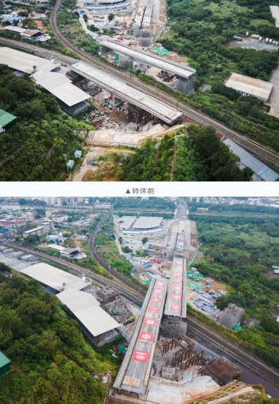 當(dāng)天7時04分,轉(zhuǎn)體橋梁開始轉(zhuǎn)體,經(jīng)過44分鐘施工,成功完成高空“二人轉(zhuǎn)”,為下一步順利實(shí)現(xiàn)通車運(yùn)營奠定堅(jiān)實(shí)基礎(chǔ)。轉(zhuǎn)體橋上跨既有漳龍線、龍東線及煤場專用線3條鐵路貨運(yùn)營業(yè)線,距離營業(yè)線最近距離僅5.9米,施工難度大,危險系數(shù)高。