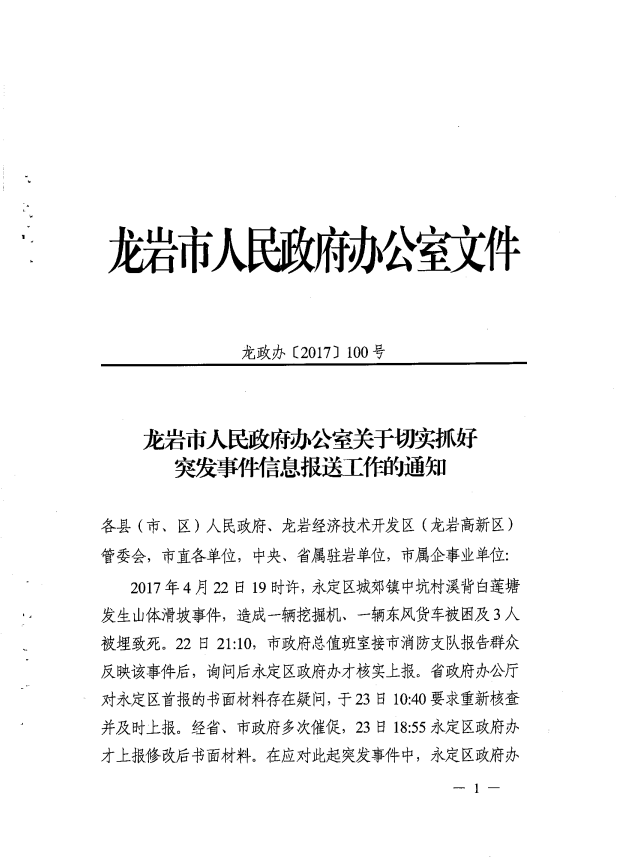 市政府辦關(guān)于切實(shí)抓好突發(fā)事件信息報(bào)送工作的通知(龍政辦【2017】100號)