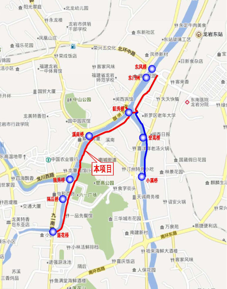 其中,沿線除東風橋、溪南橋和登高橋處采用下穿橋梁方式,其余交叉均采用平交設置斑馬線過街,工程內(nèi)容包括綠道、蘇溪河景觀平臺、隔后泉景觀節(jié)點、休憩設施、沿線綠化的改造提升、周邊機動車道的改造、沿線擋墻、圍墻、截污溝和截污井的美化提升及沿線雕塑。